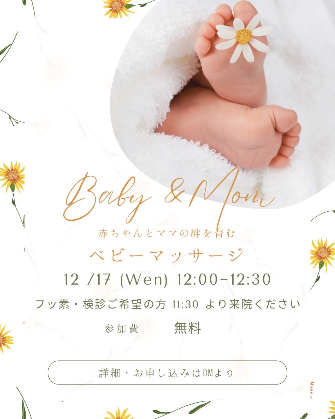 ♡ベビーマッサージのお知らせ♡ 2025/11/14 12月17日(水)12:00~ 無料ベビーマッサージ開催します!!(対象:1ヶ月健診後から一歳半ぐらいまで) 歯科健診、フッ素塗布ご希望の方は 11:30~ ※マイナンバーカードor資格確認書、子ども医療証 をお持ちください。 052-777-5788 までお問い合わせください。 ご参加お待ちしております!! 共有:Facebook